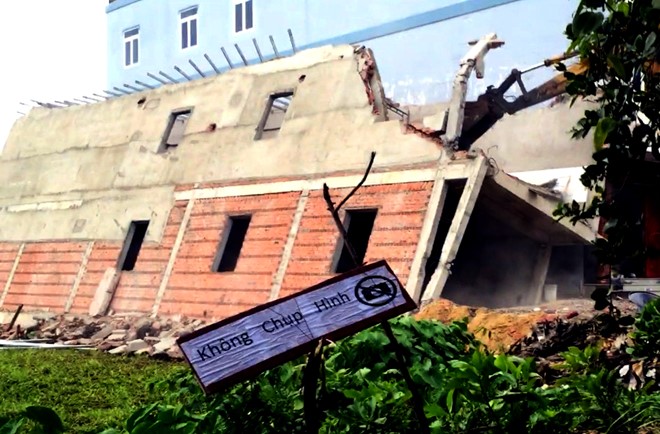 Do căn nhà đang xây (đã được 2 tầng) bị đổ sập, hư hỏng và không thể phục hồi nên chủ căn nhà đã thuê một máy xúc cùng công nhân tiến hàng tháo dỡ để bảo đảm an toàn.