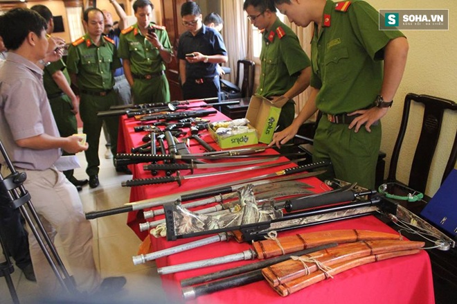 Khám xét nơi ở của đối tượng Vũ Quang Hùng, cơ quan CSĐT thu giữ kho vũ khí khủng gồm: 11 khẩu súng trong đó có 3 khẩu súng dài có ống ngắm, 8 khẩu súng ngắn, hơn 1000 viên đạn các loại, 1 hộp có 1kg đầu đạn chì, 26 bình khí còn nguyên vẹn, 9 dao, 6 kiếm, 1 rìu, 2 dùi cui nhựa, 1 nỏ bắn tên…