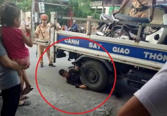 Nguyễn Văn Hiếu đã nằm xuống ôm bánh xe ô tô chuyên dụng của lực lượng CSGT, không cho lực lượng chức năng đưa xe về trụ sở.