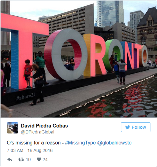 Các chữ O của Toronto được đổi mầu so với các chữ còn lại.