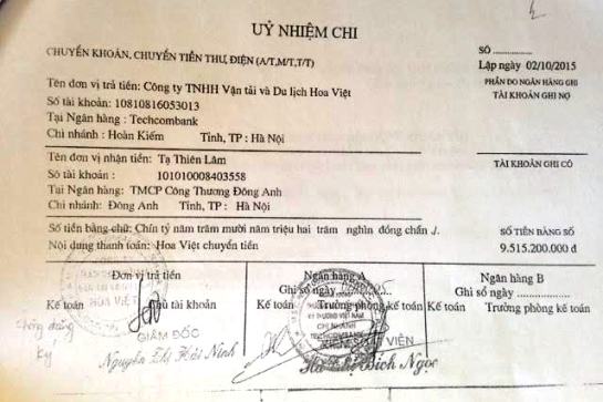 Mặt khác, đối với khoản nợ mà Công ty Hoa Việt vay của ông Long, doanh nghiệp này cho biết đã trả 9,5 tỉ đồng cho ông Tạ Thiên Long vào ngày 2.10.2015, tuy nhiên không phải gửi vào tài khoản của ông Long mà được yêu cầu chuyển vào tài khoản của Tạ Thiên Lâm. (Theo điều tra của phóng viên Báo điện tử Một Thế Giới thì hiện ông Tạ Thiên Lâm đang nắm giữ chức vụ Thành viên HĐQT Công ty CP Vận tải ô tô số 2).