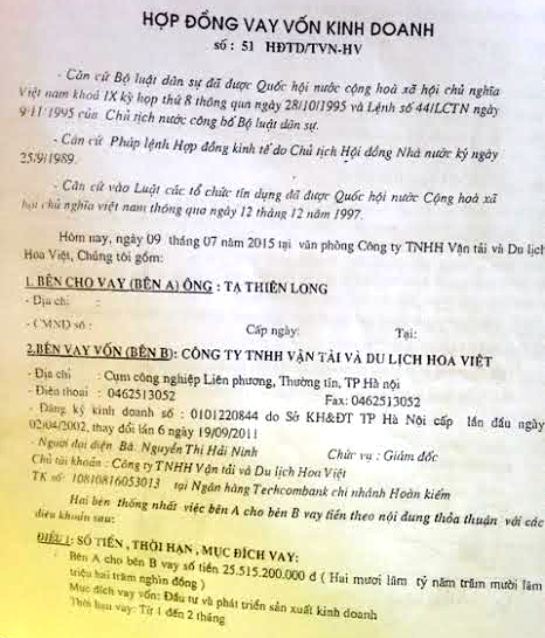 Theo đó, trong văn bản Công ty Hoa Việt cho biết, vào ngày 9.7.2015, do cần vốn để kinh doanh nên Công ty Hoa Việt đã ký Hợp đồng vay vốn số 51 HĐTD/TVN-HV với ông Tạ Thiên Long số tiền trên 25,5 tỉ đồng, với mục đích là đầu tư phát triển kinh doanh, thời hạn từ 1-2 tháng.