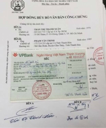 Chữ ký và chữ viết của Phạm Văn Trinh tại phòng công chứng trùng với chữ ký mang tên Giám đốc Trần Thị Thanh Xuân trong tờ séc.