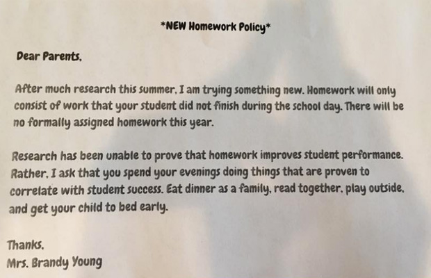 “Sẽ không có bài tập về nhà trong năm nay” – cô Brandy Young giải thích trong bức thư. “Thay vào đó, tôi đề nghị các phụ huynh dành buổi tối để làm những việc đã được chứng minh là có tương quan với sự thành công của một đứa trẻ. Cùng nhau ăn tối, cùng nhau đọc sách, cùng nhau vui chơi bên ngoài và cho trẻ đi ngủ sớm”.