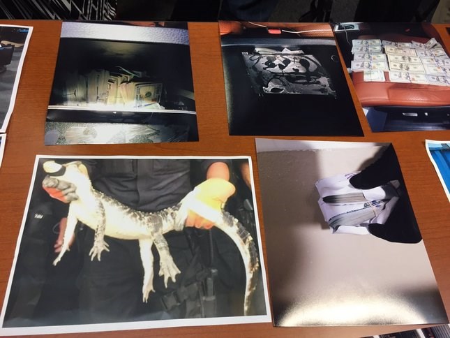 Hình chụp các tang vật do cảnh sát tịch thu được, ngoài ma túy, vũ khí, máy đánh bạc còn có một con cá sấu nhỏ - Ảnh: Bay Area News Group