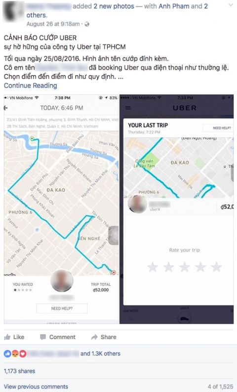 Một nữ hành khách sử dụng dịch vụ gọi xe của Uber cho biết đã vô cùng hoảng sợ khi bị người tài xế tên Đ.T dùng vật nhọn uy hiếp, cuớp tài sản gồm 3 triệu tiền mặt và điện thoại Sony M2. Sự việc đã được trình báo lên Công an phường Bến Nghé, quận 1.