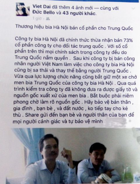 “Thương hiệu Bia Hà Nội bán cổ phần cho Trung Quốc: Công ty bia Hà Nội đã chính thức thừa nhận bán 73% cổ phần công ty cho đối tác Trung Quốc. Với số cổ phần trên thì mọi chính sách trong công ty đều do Trung Quốc nắm quyền.