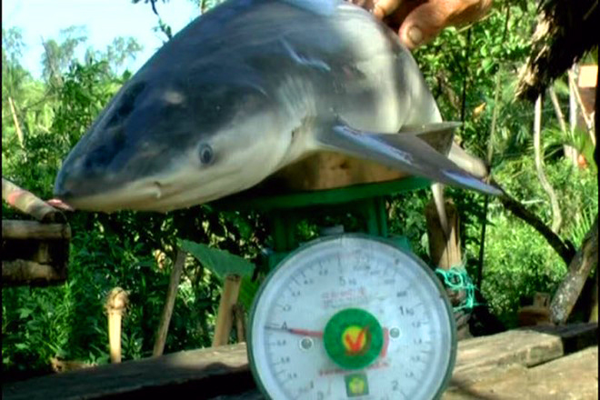Nhiều trong mấy ngày qua, người dân ở xã Trung nghĩa, huyện Vũng Liêm, tỉnh Vĩnh Long đã kéo đến nhà ông Hồ Văn Tập, 68 tuổi, để được tận mắt thây một con cá mập bị bắt trong rọ trong sông nước ngọt.