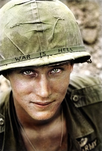 Gương mặt một binh sĩ trẻ tuổi Larry Wayne Chaffin tham chiến ở chiến trường Việt Nam. Trên mũ của người lính này có viết dòng chữ "Chiến tranh là địa ngục". Đây là một trong những bức ảnh lịch sử nổi tiếng về Chiến tranh Việt Nam do nhiếp ảnh gia Horst Fass chụp.