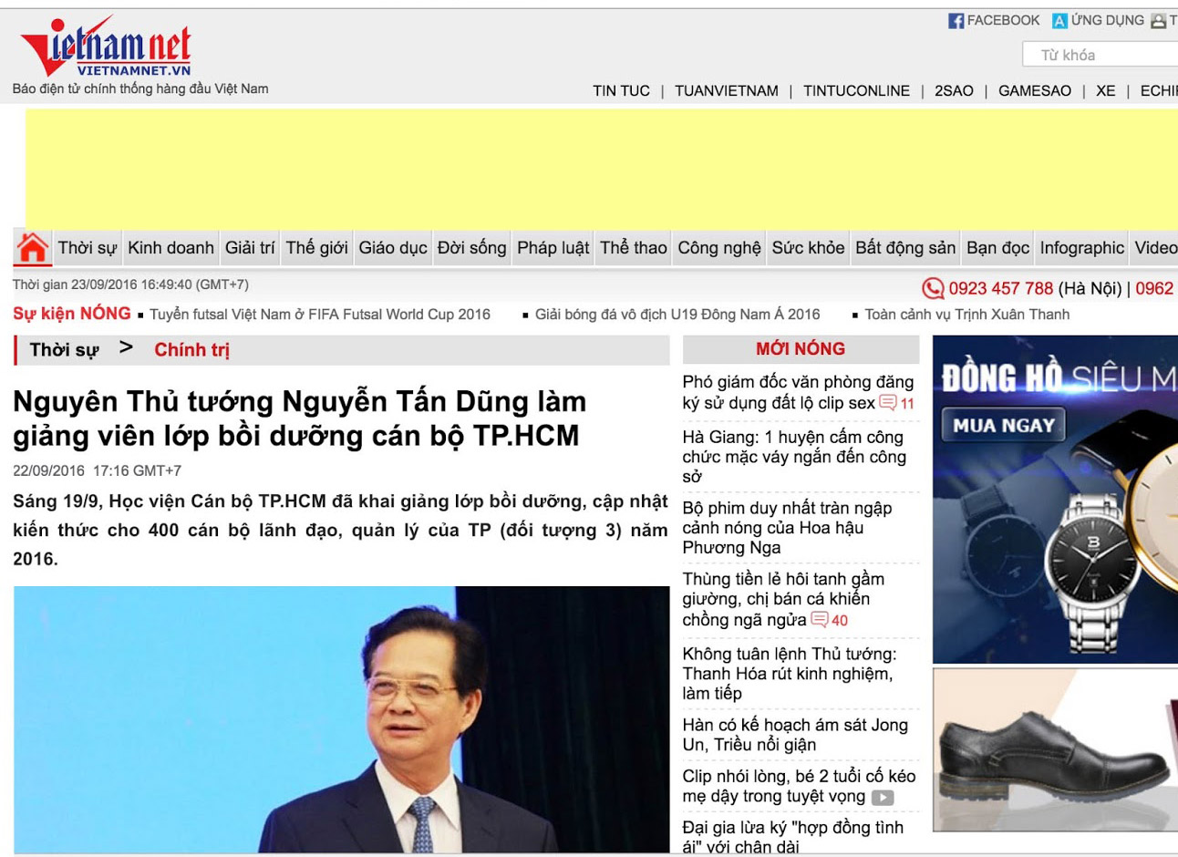 Trong bài báo có tựa đề "Nguyên Thủ tướng Nguyễn Tấn Dũng không dạy lớp cán bộ TP.HCM," tờ báo điện tử này dẫn lời giám đốc học viện Trần Hoàng Ngân cho biết, “Dù rất muốn mời nguyên Thủ tướng Nguyễn Tấn Dũng cùng tham gia giảng dạy tại trường tuy nhiên, do ông quá bận nên không thu xếp được lịch. Ông chỉ tham gia nói chuyện, chia sẻ kinh nghiệm trong các báo cáo chuyên đề của trường.”