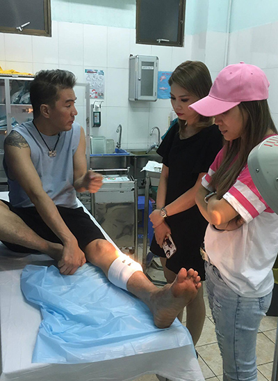 Nam ca sĩ phải vào bệnh viện khâu 6 mũi cho vết thương do cây sắt đâm vào bắp chân khi bị ngã từ sân khấu ở buổi tập "Diamond show", tối 30/9.