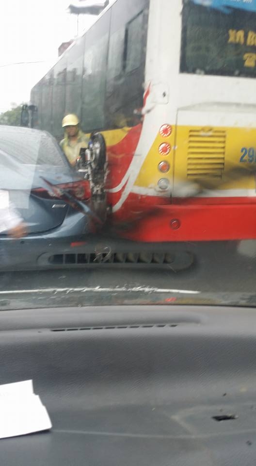 Trên một diễn đàn nổi tiếng, facebook T.N.T đã chia sẻ những bức ảnh gây không ít ức chế cho anh vào sáng nay: một người phụ nữ cùng chiếc xe máy hoàn toàn bị mắc kẹt giữa chiếc xe bus và một chiếc ô tô con.