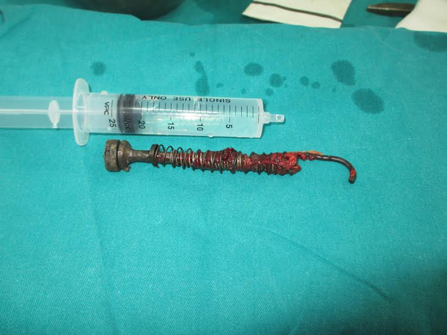 Nhìn lại dị vật đã găm sâu vào mặt bệnh nhân Trương Văn T. 43 tuổi (Tuyên Quang) lúc đó chúng tôi không khỏi rùng mình. Đó là một chiếc đinh vít cỡ cực đại có các vòng lò xo xoắn xung quanh thân kèm móc sắt uốn cong như lưỡi câu ở phía đầu.