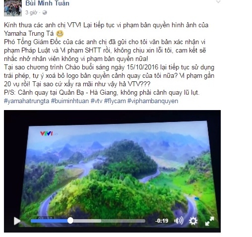 Anh Tuấn cho hay, vừa phát hiện Đài truyền hình Việt Nam VTV ăn cắp một đoạn trong clip “Việt Nam qua góc nhìn Flycam” được anh quay tại đoạn khúc cua Quản Bạ - Hà Giang, để phát tại chương trình “Chào buổi sáng” trên kênh VTV1 vào ngày 15.10.2016.