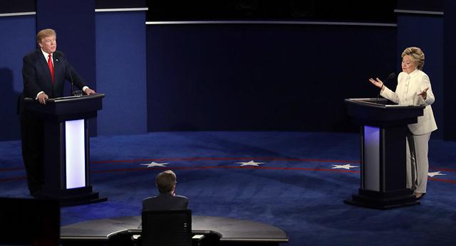 Hai ứng viên tổng thống Mỹ năm 2016, Donald Trump và Hillary Clinton, trong cuộc tranh luận lần 3 hôm 19/10. Ảnh: Reuters.