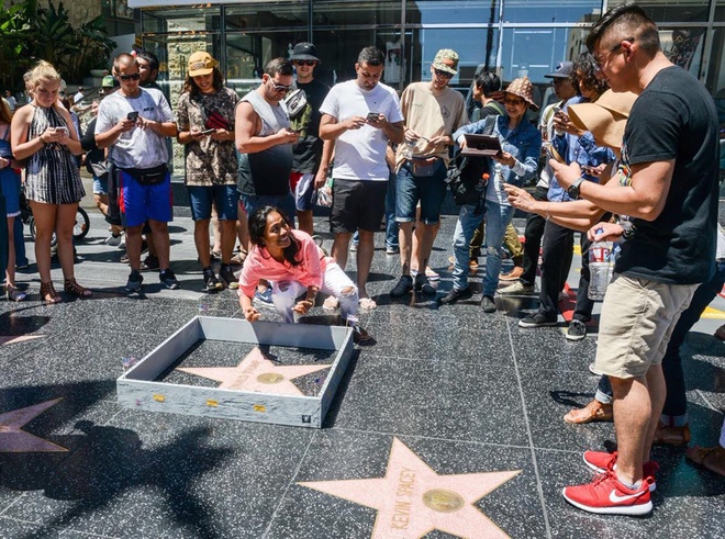 Trong hơn 2.500 ngôi sao trên Đại lộ Danh vọng Hollywood (Los Angeles, Mỹ), ngôi sao Donald Trump được bảo vệ từ những ngày đầu tân tổng thống còn chạy chiến dịch tranh cử. Jamie Otis, một người đàn ông cải trang thành công nhân xây dựng, đã sử dụng búa tạ và cuốc để phá hủy ngôi sao này. Stuff đưa tin Otis sẽ phải chịu trách nhiệm cho tội phá hoại. Ảnh: Twitter.