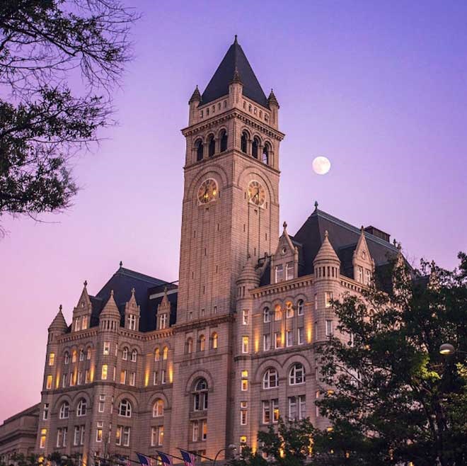 Nằm cách Nhà Trắng hơn một km, Trump International Hotel tại Washington DC (Mỹ) là khách sạn mới nhất trong chuỗi khách sạn của tổng thống Trump. Công trình này được tu bổ lại từ Bưu điện Pavilion từ năm 1899, là nơi tổ chức tiệc khiêu vũ lớn nhất Washington DC với "Phòng khiêu vũ Tổng thống". Giá phòng của khách sạn này từ 460 USD đến 12.000 USD/đêm. Nếu du khách muốn đặt riêng một căn liền kề, giá là 25.050 USD/đêm. Ảnh: Instagram.