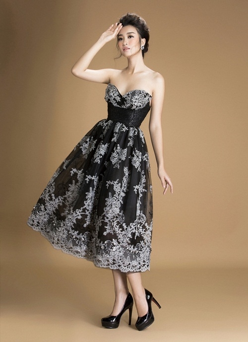 Thiết kế váy quây ngực có phần thân áo được giữ nguyên sắc đen tuyền. Trong khi đó, tùng váy được xử lý tạo khối bồng bềnh lãng mạn. Chi tiết ánh kim lấp lánh điểm xuyết trên phần chân váy tăng độ bắt sáng.