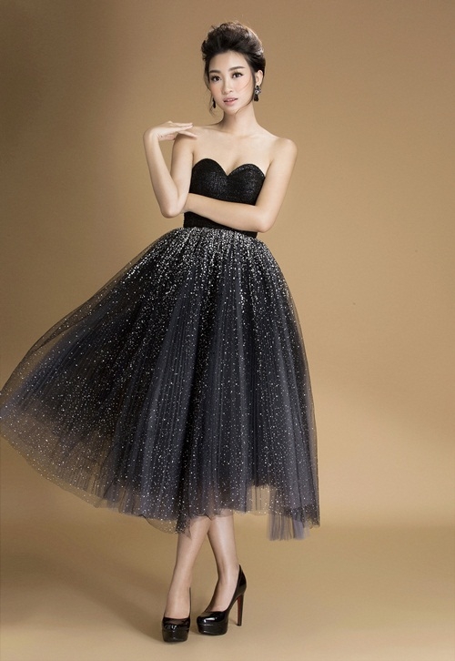 Hoa hậu Mỹ Linh diện trang phục đầm cup ngực, khoe bờ vai trần gợi cảm. Ở trang phục này, hoa hậu khoe dáng với thiết kế cúp ngực tông đen. Phần chân váy bồng xòe giúp người mặc tạo dáng tự do và phóng khoáng hơn.