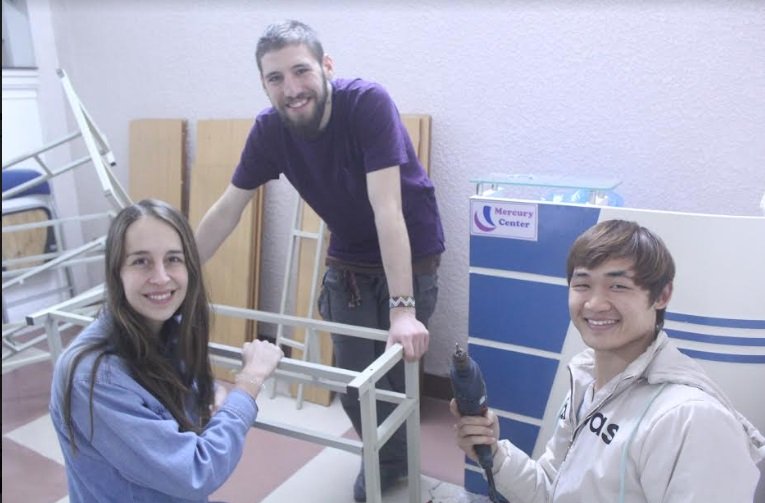 Tình nguyện viên Sarah và Dino cùng Hòa đóng bàn ghế chuẩn bị cho lớp học ở Cổ Nhuế. Ảnh: NVCC
