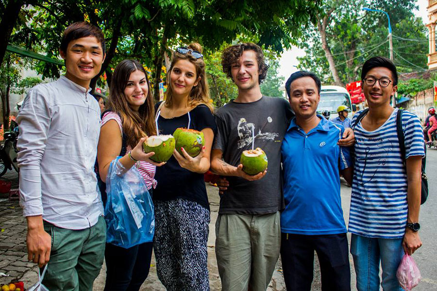 Hòa và các tình nguyện viên quốc tế trong một dịp dạo phố phường Hà Nội. Ảnh: NVCC