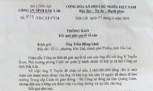 Thông báo giải quyết đơn tố cáo của công an tỉnh Đắk Lắk
