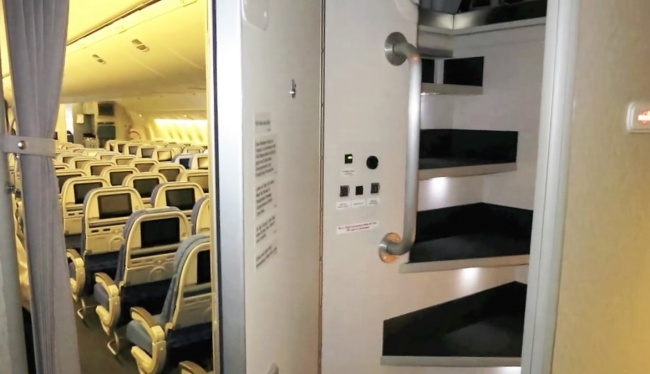 Thoạt nhìn, bạn sẽ không thể biết được căn buồng bí mật này nằm ở đâu, nhưng hãy xem hình ảnh dưới đây. Wow! Thật ngạc nhiên là nó được thiết kế nằm ngay phía trên khoang thương gia.Thiết kế này có ở 2 máy bay Boeing 777 và Boeing 787. Để đi lên căn phòng bí mật đó, có một cầu thang nhỏ khuất sau cánh cửa ở gần khoang lái. Các tiếp viên sẽ có chìa khóa riêng hoặc một mã code để mở cánh cửa đó.