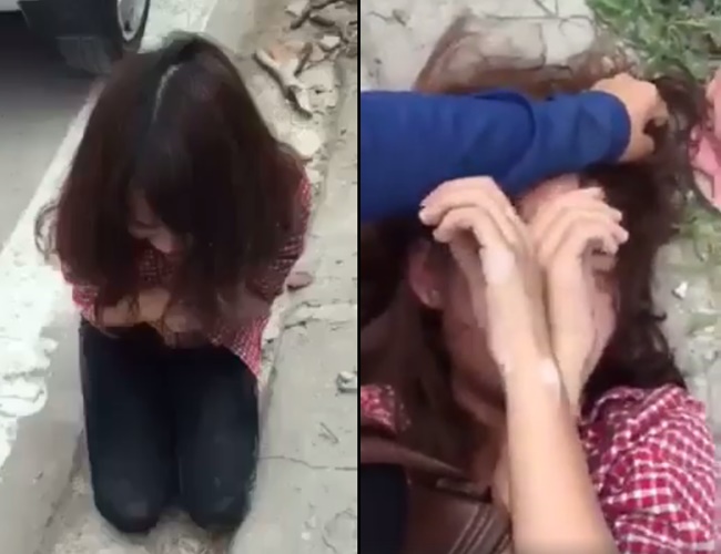 Hình ảnh trong 2 clip cho thấy, cô gái áo kẻ đầu tóc bù xù, quần áo đầy bụi đất đang quỳ rạp dưới đường, khóc thút thít, khi 1 người đàn ông ngồi gần đó cất tiếng hỏi "Mày đi học hay mày đi làm gì?", cô gái trẻ nức nở: "Anh tha cho em". Tuy nhiên người phụ nữ đi đánh ghen đứng bên cạnh không ngừng văng tục chửi bới, "cặp kè với chồng người ta về còn nhắn tin thách thức à? Mày trình bày đi, đi ngủ với chồng tao ở nhà nghỉ mà không lên tiếng được à. Ngẩng cái mặt lên xem nào".
