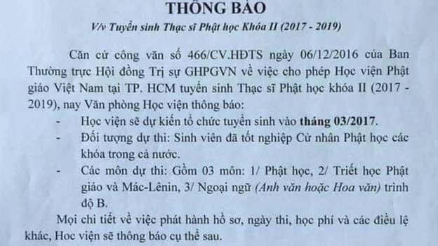 Hôm 19/12, website của Học viện Phật giáo Việt Nam tại TP. Hồ Chí Minh đăng thông báo về việc tuyển sinh thạc sĩ Phật học khóa 2 dự kiến tổ chức vào tháng 3/2017.