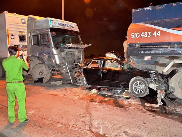 Vụ tai nạn liên hoàn xảy ra vào tối nay (20.12) trên cầu Phú Mỹ (TP.HCM) khiến cho xe ô tô Camry biến dạng hoàn toàn. Vụ việc khiến tài xế xe ô tô Camry kẹt cứng trong cabin, dù được người dân đưa đi cấp cứu nhưng đã bị tử vong.Đến 21h tối nay, lực lượng chức năng quận 2 (TP.HCM) vẫn đang phong tỏa khám nghiệm hiện trường vụ tai nạn giao thông nghiêm trọng trên cầu Phú Mỹ, phường Thạnh Mỹ Lợi, quận 2.Công an quận 2 cho biết, lúc 18h ngày 20.12, xe ô tô 4 chỗ BKS: 51A-416.58 chạy trên cầu Phú Mỹ hướng quận 7 qua quận 2, khi tài xế đang cho xe đổ dốc xuống cầu Phú Mỹ thì bất ngờ bị xe bồn BKS: 51C-483.44 húc mạnh vào sau đuôi. Vụ va chạm khiến cả hai phương tiện phanh gấp nên chiếc xe ô tô Camry BKS: 51A-240.40 do tài xế Huỳnh Thanh Dũng (42 tuổi, ngụ quận 5, TP.HCM) chạy phía sau phải phanh gấp.