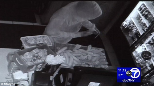 Vừa qua nhà hàng tại đảo Long Island, Mỹ đã bị một tên trộm đột nhập và camera đã ghi lại được toàn bộ sự việc. Tuy nhiên điều đáng nói là tên trộm kỳ quặc này đã ăn 10 quả chuối, 10 túi khoai tây chiên rồi lăn ra ngủ ngay tại chỗ. Hắn đã thức dậy và rời đi trước khi chủ nhà hàng tới mà không lấy bất cứ thứ gì.