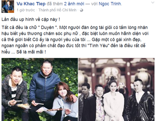 Ngay sau khi đại gia Hoàng Kiều công khai nói về chuyện tình cảm với người mẫu Ngọc Trinh, ông bầu Khắc Tiệp cũng chính thức lên tiếng. Trên trang cá nhân của mình, ông bầu Vũ Khắc Tiệp chia sẻ, chuyện tình yêu giữa đại gia Hoàng Kiều và “nữ hoàng nội y” là “duyên”.