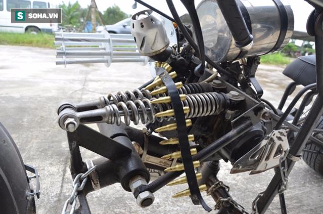 Đặc biệt, phần khung xe được cuốn dây xích sắt, trên xe có "súng đại liên" với phần đạn giả được chế lại nhìn qua như đạn thật, 6 nòng nòng súng là những ống thép nhỏ có khả năng quay khi tăng ga.