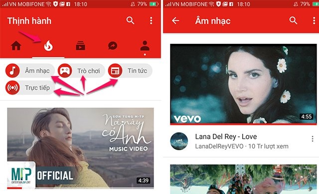 Trên YouTube có hàng sa số video nhưng không phải cái nào bạn cũng muốn xem, vì thế bạn có thể lọc theo từng chủ đề như Âm nhạc, Trò chơi, Tin Tức hoặc Trực tiếp để tìm đến những video mình muốn.
