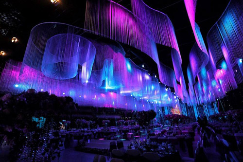 Không gian đám cưới lấy cảm hứng từ chủ đề cực quang. Hai bên gia đình đã thuê một bãi đất trống gần nhà rồi dựng thành nhà hàng 5 sao trong 1 tuần để phục vụ sự kiện trọng đại.