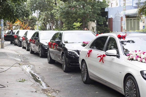 Trong lễ rước dâu buổi sáng, chú rể đã huy động 9 chiếc xe Maybach (mỗi chiếc hơn 10 tỷ đồng) để hỗ trợ cho đám cưới của mình.
