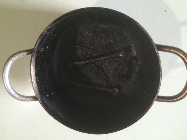Quả thực, nhìn đi nhìn lại, nhìn tái nhìn hồi, dùng kính lúp soi cũng không biết miêu tả cái nồi ở trên đã - từng - dùng - để - nấu - gì, bởi tất cả chỉ còn là một màu đen quyến rũ, với... 2 chiếc xương cẳng gà vẫn "kiên cường" sót lại. Ngay khi chủ nhân của màn thảm họa nấu ăn này tự đăng ảnh lên than khóc với chị em, hàng trăm bình luận đã nổ ra không ngớt. Ai cũng phải ôm bụng cười ngặt nghẽo vì món gà hầm "hỏa thiêu" cháy đen sì, còn kinh hơn cả những sự cố nấu nướng từng đi vào lịch sử như trứng xào cà chua cả vỏ, canh cua nguyên con, canh mồng tơi cua không thèm lọc bã...