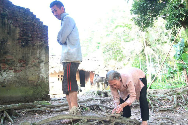 Trong số mấy người con dại, bà Lực bảo chăm con út là anh Toản (35 tuổi) vất vả nhất. Không giống như các anh chị mình, anh Toản có tính hay đi. “Cứ hở ra là nó đi, không biết đường về đâu. Nhiều hôm tôi phải đi tìm cả đêm mới thấy. Nhiều lần tắm cho nó, nó không hài lòng nó đẩy tôi ngã. Sợ con đi không biết đường về, tôi phải lấy dây thừng buộc vào gốc cây hay trước cửa nhà”, bà Lực vừa nói vừa buộc chân con trai lại.
