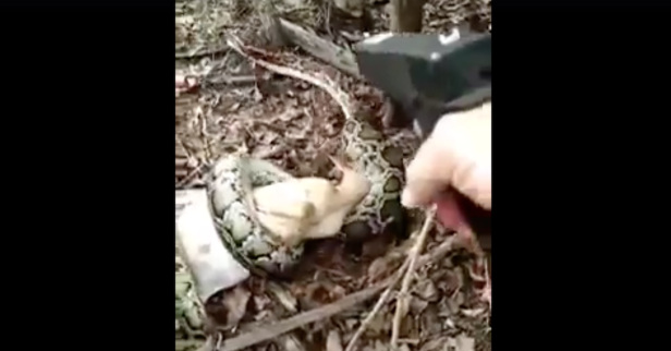 Con trăn có lẽ không ngờ rằng mình phải đón nhận kết cục bi thảm chỉ vì tham ăn. Trong video, một thành viên trong gia đình mang theo khẩu súng ngắn đến gần và nã nhiều phát đạn vào con trăn.
