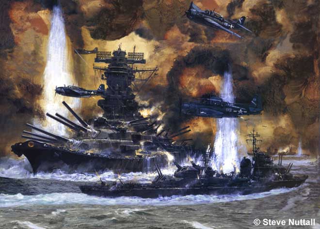 Trong ṿng hai giờ, đội tàu chiến Nhật Bản bị oanh tạc không ngừng nghỉ bởi số máy bay chiến đấu Mỹ. Kế hoạch được vạch ra rơ ràng nhưng khi tiếp cận mục tiêu, phi công Mỹ nào cũng muốn tấn công Yamato nên mệnh lệnh đưa ra là tự do khai hỏa. Số lượng chiến đấu cơ Mỹ quần thảo ngay trên chiến hạm Yamato nhiều đến mức họ có thể gặp nạn v́ đâm vào nhau.