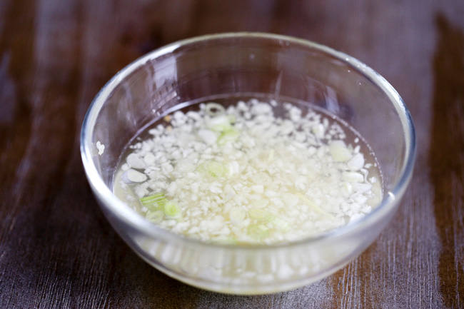 - Trong khi đó, bỏ gừng, tỏi, dọc hành và một nhúm muối vào một bát nhỏ, thêm vào một chút nước ấm. Ngâm 5-10 phút.