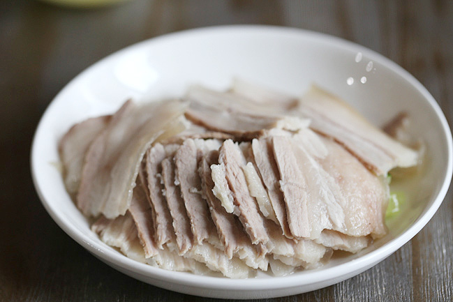 - Thịt ba chỉ đã chín, vớt ra ngoài. Để nguội và xắt thành lát càng mỏng càng tốt.
