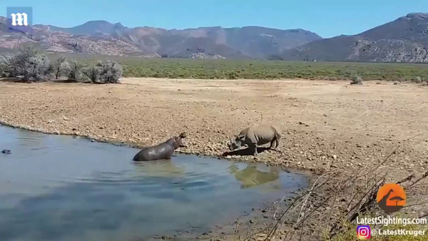 Hà mã đã vô cùng "máu lửa" khi tê giác có ý định xâm chiếm lãnh thổ của nó. Ngay lập tức, nó đã tấn công tê giác đến mức ngã dúi dụi xuống nước. Nếu con tê giác còn sừng, có lẽ hà mã sẽ là kẻ gặp nạn trong trận chiến này.