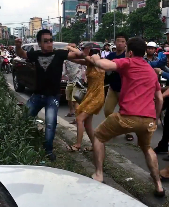 Nhiều người đi đường cố gắng can ngăn hai thanh niên Việt Nam, trong khi một cô gái mặc váy vàng (dường như là bạn gái thanh niên ngoại quốc) cố đẩy “anh Tây” này ra xa.