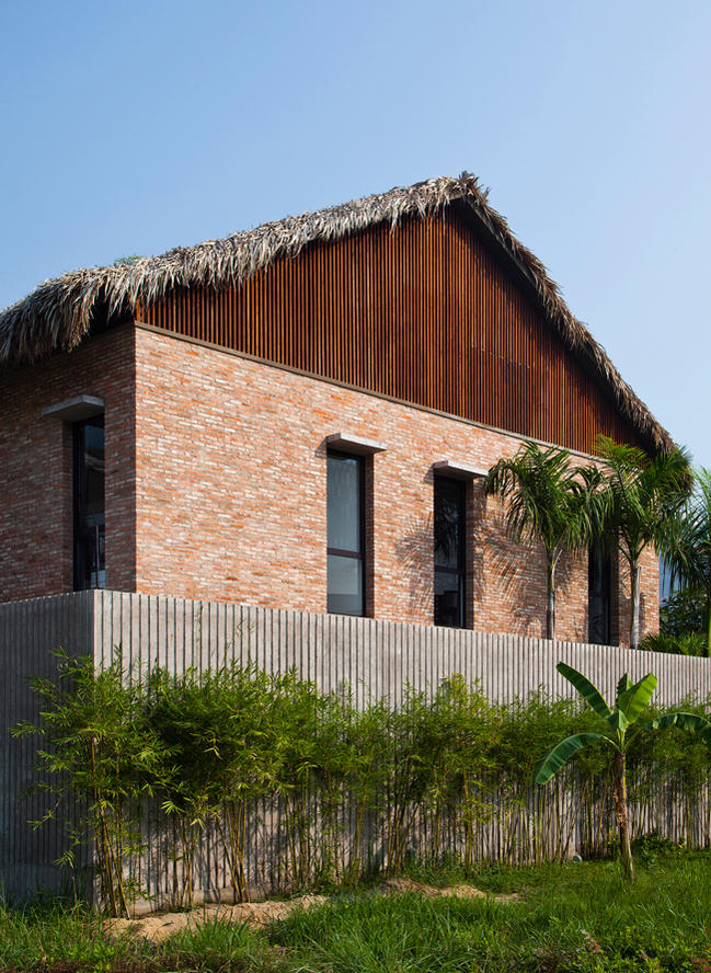 Nhà được lợp mái lá, tường xây gạch mộc, tạo cảm giác yên bình, gần gũi.