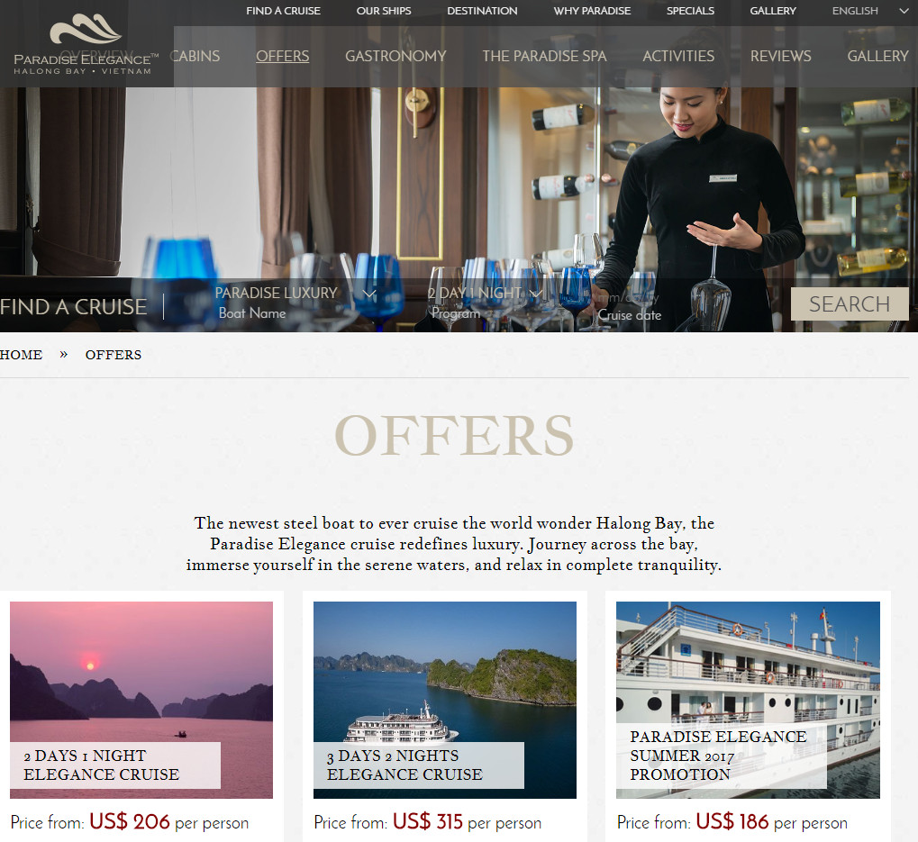 Du thuyền Paradise Elegance bao gồm 5 tầng, với các dịch vụ spa, nhà hàng, sun deck và 2 quầy bar.