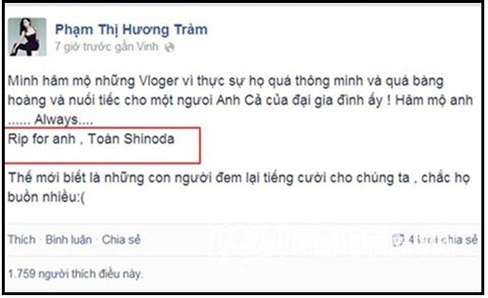Thời điểm Vlogger Toàn Shinoda qua đời, nhiều sao Việt đã bày tỏ sự tiếc thương của mình trên mạng xã hội, trong đó có Hương Tràm. Cô bày tỏ: "Mình hâm mộ những Vloger vì thực sự họ quá thông minh và bàng hoàng và nuối tiếc cho một người anh Cả của đại gia đình ấy! Hâm mộ anh... Always... Rip for anh, Toàn Shinoda. Thế mới biết là những con người đem lại tiếng cười cho chúng ta, chắc họ buồn nhiều".