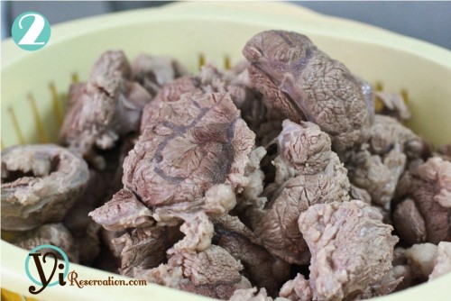 - Trần thịt bò qua nước sôi. Rửa thịt bò bằng nước lạnh và để ráo nước.