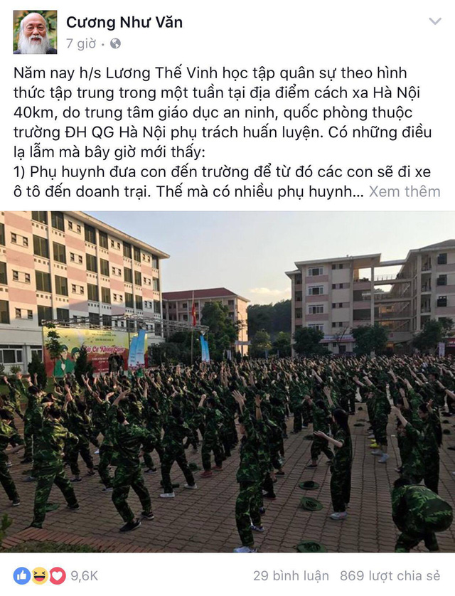 Ngày 1/8, trên trang facebook cá nhân, PGS.TS. Văn Như Cương - Chủ tịch Hội đồng quản trị Trường THPT Lương Thế Vinh chia sẻ câu chuyện về kỳ học quân sự của các học sinh ở trường mình.