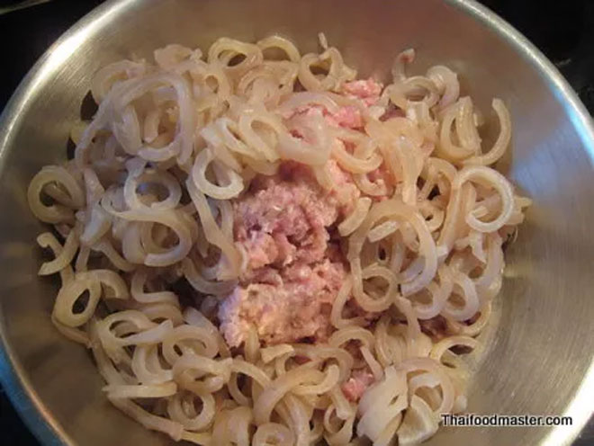 Cho tất cả các nguyên liệu thịt, bì, tỏi băm, cơm nếp, muối, đường và mì chính vào một bát to. Dùng tay trộn đều hỗn hợp thật kỹ.